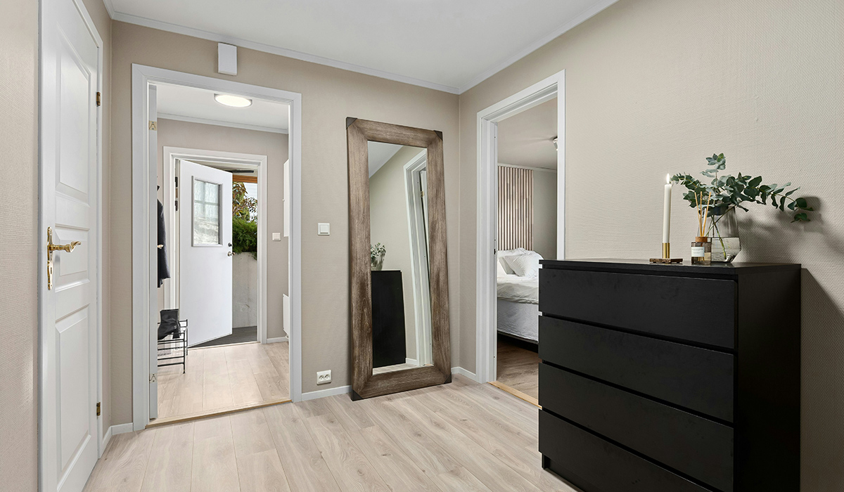 Светлая прихожая встречает спокойствием домашнего уюта и элегантной отделкой. Пол выстилает ламинат Kronospan Vintage Classic K474 Модрина Ойсче 4V 10 мм, что обогащает интерьер натуральной структурой древесины. Обои виниловые Vinil Остин СШТ 2-1557 холодно-бежевые на стенах эффектно сочетаются с белым цветом дверей, наличников, потолка, плинтуса Омис МДФ гладкого 80*16*2400 мм и создают стильную композицию прихожей. Полка для обуви Artex 67156 67*19*33 см является практичным решением для помещения, что позволяет поддерживать порядок и чистоту у входа. В элегантном комоде Merx Moderno МН300 антрацит 26009024 можно хранить одежду и домашние вещи, он также дополняет эстетику комнаты глубоким темным цветом. Букет в вазе, подсвечник Ester & Erik 777-90 средний золотой 2,2*6 см, ароматизатор - важные детали, подчеркивающие вкусы, предпочтения и индивидуальность хозяев.