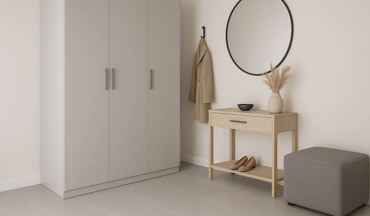 Светлая прихожая создает визуальное ощущение легкости и чистоты всего дома, а современные материалы для отделки позволяют сделать ее практичной и функциональной. В данной комнате пол выложен плиткой Opoczno Mateo grey 42*42 см серого цвета, что расширяет пространство и добавляет света. Она обладает высокой устойчивостью к механическим повреждениям, воздействию влаги и воды, поэтому надолго сохранит свой привлекательный внешний вид. Стены молочного цвета элегантно украшает и защищает от загрязнений плинтус Grand Decor HCR520 99*12*2000 мм. Он также может маскировать коммуникации для аккуратного вида комнаты. Большой трехдверный шкаф MiroMark Меги серая шиншилла – это настоящая находка для прихожей. Здесь можно хранить одежду, обувь, зонты или другие вещи, не загромождая пространство. Перед выходом из дома можно прихорошиться перед зеркалом Duoo 80*80 см черным, а наиболее часто используемые вещи оставлять на крючке двойном Сяйво графит. Мягкий пуф DLS Бар серый добавляет изысканности интерьеру и удобства при обувании. Нежный декор в виде сухоцветов на столике рисует естественный завершающий штрих в совершенной композиции прихожей.