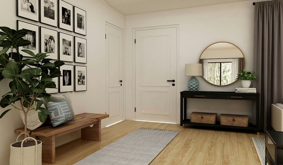 Элегантная светлая прихожая создает приятное впечатление и демонстрирует функциональность деталей, гармонично сочетающихся в современном интерьере. Мягкий теплый фон стен создает краска интерьерная AQUAMARINE MATTLATEX INTERIOR 14 кг белого матового оттенка. Ламинат Peli Parquet Anatolia Cream AN904 4-V 33 класс 8 мм вносит природные узоры древесины и добавляет света и пространства комнате. Межкомнатные двери ПВХ Омис Smart C070B 800 мм дуб маренго аккуратно дополняют эстетику стен и завершают гармонию белых оттенков. Зеркало Luxury Wood Ultra SLIM ясень натуральный 77 см находится напротив окна, поэтому увеличивает количество естественного света в прихожей. Широкая удобная лавочка украшена подушками декоративными Decorator B 229 45*45 см хаки, а стена за ней роскошно украшена картинами Графика 35,5*35,5 см в сочетании с жизнерадостными фото жителей. Плетеные коробки и кашпо добавляют уюта помещению, а ухоженный вазон оживляет сдержанное пространство.