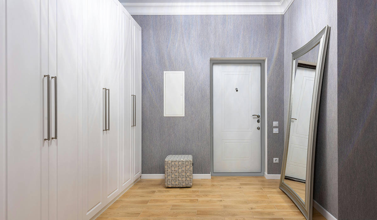 Небольшая прихожая станет просторнее и светлее, если сочетать мягкость серого цвета с классическим воздержанием белого. Тёплый натуральный оттенок ламината Rezult Floor Nature FN102 Дуб классический 32 класс 8 мм создает особую атмосферу уюта. Обои виниловые Версаль 931AS34 с приятной рельефной поверхностью варьируют оттенками серого в зависимости от освещения. Изящное обрамление снизу творит плинтус Classen Basic Pure+ 57126 78*16*2400 мм, а сверху – плинтус потолочный Marbet LUX E-33 86*56 мм 2 м. Нарядные фасады шкафов и двери металлические Министерство Дверей Vinorit 3ПК-198 серая текстура 96*205 см правые создают ощущение изысканной элегантности. Просторное зеркало увеличивает простор и роскошно дополняет интерьер.