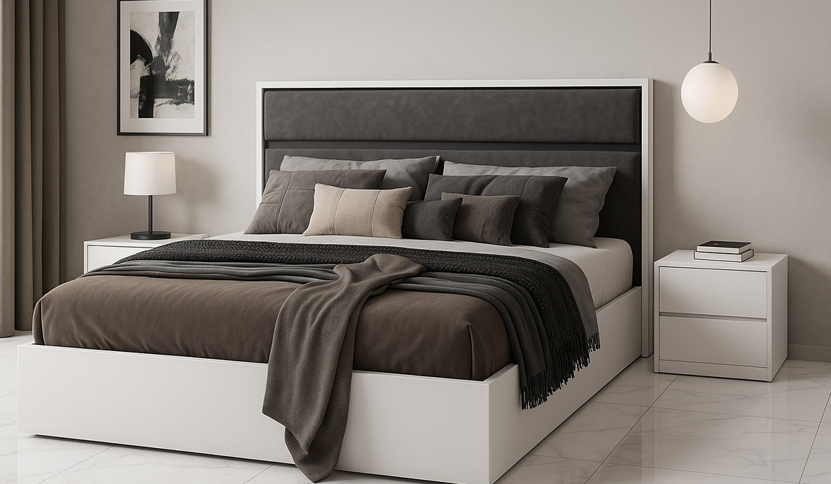 Собирая пазлы идей для удачного дизайна спальни, стоит уделить внимание стильному сочетанию молочных оттенков и глубокого шоколадного, как на фото. Такое цветовое решение положительно влияет на психику и помогает преодолевать последствия стресса. Светлый глянцевый пол, отделанный керамогранитом Cerama Market Carrara Absolute 60*60 см, дарит легкость и невесомость, способствует качественному отдыху и хорошему настроению. Его роскошный блеск мягко сбалансирован матовой структурой стен, покрытых жидкими обоями Yurski Ландыш 402 1 кг белыми. Двуспальная кровать с подъемным механизмом Aqua Rodos Atlanta BED-1600-lift-white-gloss 160*200 см белая поражает эффектным сочетанием цветов и высоким качеством материалов. Мягкое изголовье из бельгийского микровелюра премиум качества добавляет изысканности и элегантности комнате, а коричневые подушки разных оттенков и плед Lanavitta Меланж 21324237 140*200 см серый — комфорта во время отдыха. Функциональность белых прикроватных тумб MiroMark Тибо М1164 супер мат дополнена лаконичной формой настольной лампы Sirius B N6568/1T CH, которая обеспечивает теплое мягкое освещение для уюта спальни.