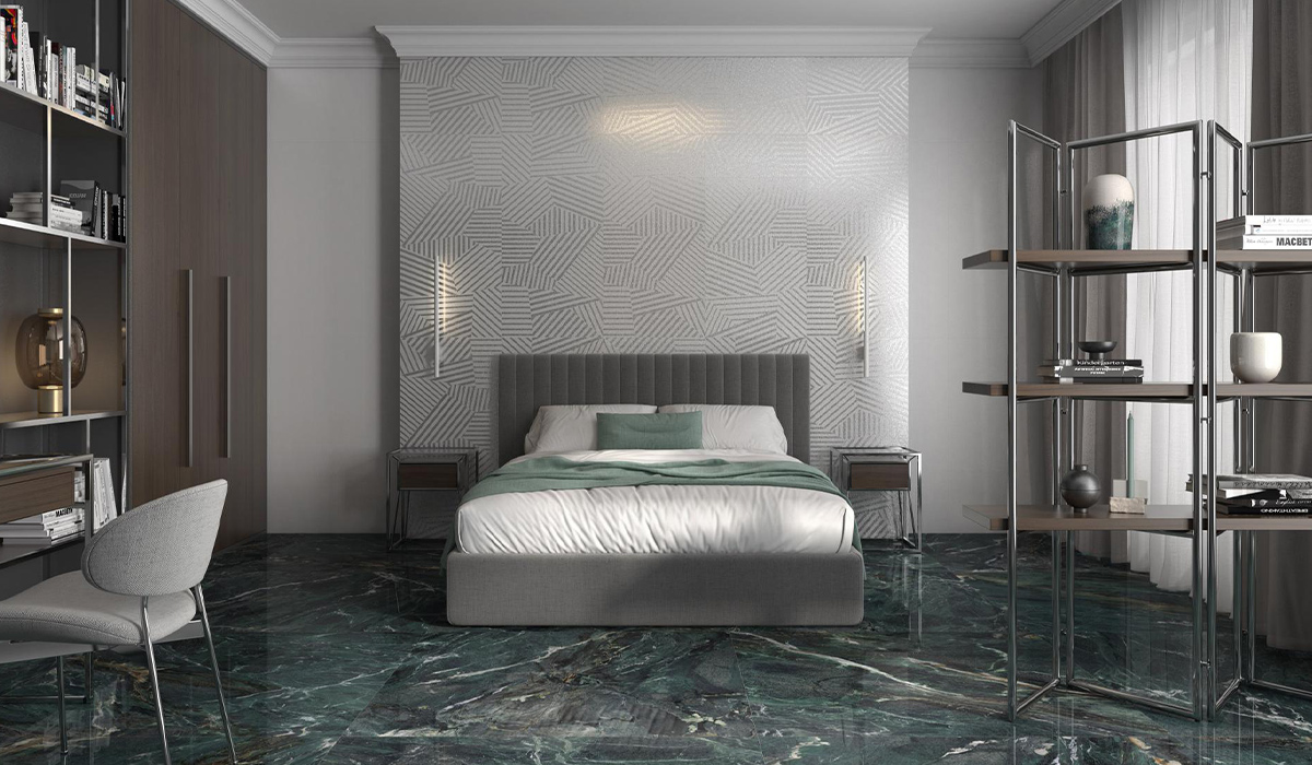 Развитие технологий и новейшие вызовы общества способствуют интеграции пространства наших домов в многофункциональные помещения. Эти тонкости и изменения легко улавливают дизайнеры, предлагая эстетические и практичные решения интерьеров, таких как дизайн спальни на фото. Эта просторная комната может стать репрезентативным образцом современной культуры и образа жизни человека. Здесь комфорт спального места, демонстрирующий кровать Richman Санам 180*200 темно-серое, является центральным выразительным акцентом. Естественно, что много работающий человек нуждается в качественном отдыхе. Комплект постельного белья Frette Enrichetta FRCOT01 200*220 см является не только изысканным украшением кровати, он также отвечает актуальным требованиям покупателей: натуральность, гипоаллергенность, воздухопроницаемость и высокая износостойкость. Особого внимания заслуживает пол комнаты, украшенный керамогранитом Cerrad La Mania Brazilian Quartzite green pol 119,7*279,7 см зеленый. Он убеждает, что такое покрытие является не только практическим решением, облегчающим уборку, но и отличным художественным элементом, создающим монументальное пространство вечной красоты камня и его динамического характера. Пол изменяет само восприятие спальни как комнаты отдыха, придавая ей новые смыслы и значения. Светлое исполнение стен и обрамление потолочным плинтусом Marbet LUX E-33 86*56 мм 2 м сбалансирует прочность и роскошь керамогранита, придавая легкости, невесомости и простоты. Важным элементом современного интерьера световое оформление. Светильники светодиодные настенные Luminaria Stick 8W L600 220V белые над изголовьем создают выразительные композиционные акценты и многогранную игру света. Их элегантный дизайн убеждает, что hi-tech в спальне не нарушает уюта и гармонии. Металлические детали мебели, стильный декор, книги, ваза Bohemia White Matt 82562-382248 30 см – безупречный набор, характеризующий не только личность владельца, но и ритм его жизни.