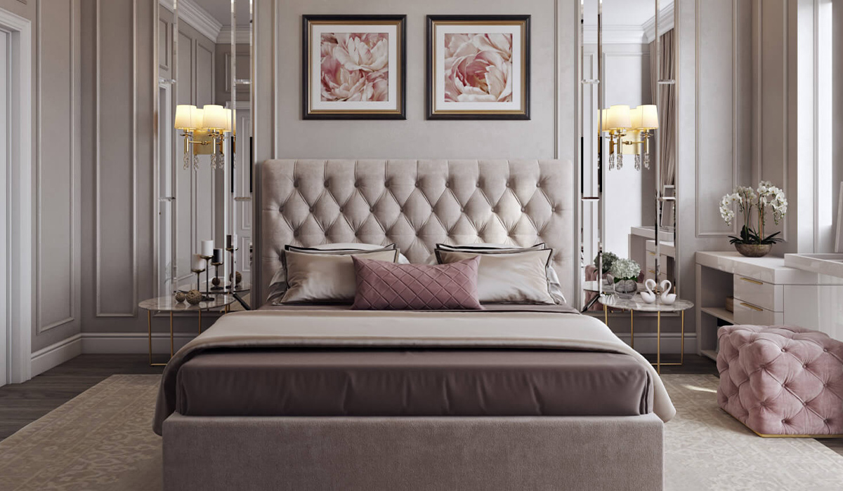 Романтические мотивы спальни с элементами роскоши позволяют почувствовать себя по меньшей мере королевской особой. Изысканная помпезность кровати Richman Лондон 180×200 молочного цвета демонстрирует богатство и шарм, где снятся волшебные сказки Шахерезады, а тело получает щедрую порцию восстановления и сил. С комплектом постельного белья Soho Boutique Wave A130112 200×230 см отдых становится еще более приятным и комфортным. Элегантный контраст создают серые стены с темным ламинатом Floorpan Prime Akashi FR010 32 класс 4V 8 мм на полу. Белый плинтус Grand Decor HCR513 100×15×2000 мм рисует нарядные линии между ними, добавляя визуальной глубины и структурности. Интересным элементом интерьера является розовый велюровый пуф-трансформер Twinsann 5 в 1 Париж 19, напоминающий сладковатую эстетику бенто-тортика. Эффектные бра на зеркальных поверхностях умножают свет в отражении, создавая многомерные порталы красоты и величия. Грациозные фигурки лебедей, изящные подсвечники и невесомая веточка гортензии в прозрачной вазе Bohemia Irene B82508 17,5 см наполняют атмосферу спальни тонким шармом нежности и романтики.