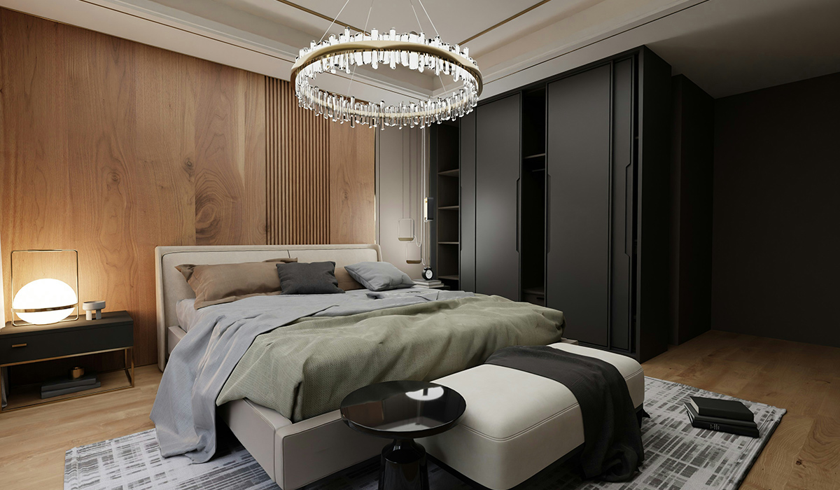 Темные глубокие цвета спальни прекрасно подойдут людям, которым важен процесс засыпания и атмосфера полного расслабления. Успокаивающий эффект такого помещения является целебным для нервной системы. Комната, что на фотографии, сочетает элегантность светлой мебели и аристократичность темной отделки. Спальня набирает цвета и естественного рисунка древесины, которой декорированы стены. Ламинат Kronopol Parfe Floor Synchro 7104 Дуб Лорето 32 класс 4V 8 мм на полу усиливает эффект деревянных поверхностей. Просторная кровать Dommino Зара бежевого цвета гармонирует с изяществом потолка, а удобная банкетка DLS Атлас 1 молочная, кроме эстетической функции, имеет много практических применений. Комфорт кровати дополняет подушка декоративная Decorator B300 45*45 см черная и Decorator B 237 45*45 см серая. На тумбе прикроватной Merx Life ЛФ200 антрацит 26010166(П) размещена стильная лампа, добавляет теплого уютного света в темное время суток.
