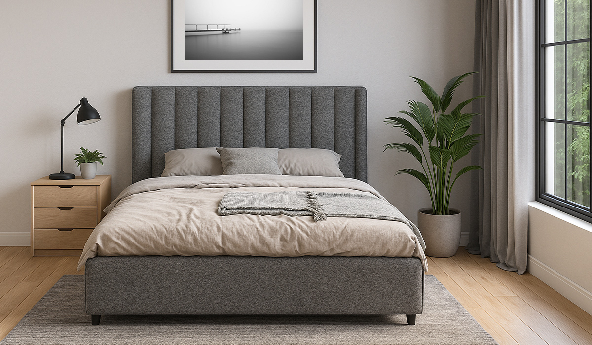 Светлая спальня станет настоящим оазисом домашнего уюта, если выбрать качественные материалы для отделки, сочетать их в стильных цветах и добавить яркий свежий декор. В изображенной комнате использована идея простоты и естественной легкости современного интерьера. Отличным решением для отделки пола стал ламинат Kronospan Atlantic К453 Дуб Бискотти 32 класс 4V 8 мм, который создал идеальный природный фон спальни. Стены покрыты краской дисперсионной Dufa Super Mix B3 transparent 9 л и отделаны плинтусом Arbiton STIQ 80 ST820 белый 2200 мм. Просторное окно обеспечивает достаточное освещение комнаты, что способствует росту и развитию комнатных растений. Лучший отдых и сладкие сны подарит кровать Zlatamebel Пасадена 180*200 см Magnum 424 серая, которая традиционно занимает центральное место и является основным акцентом интерьера. Стильное белье и плед Lanavitta Topaz 155248 140*200 см серый дополняют эстетику спального места, добавляя комфорта и уюта. На тумбе мы видим настольную лампу Ardero DE1430ARD E27 черную, которая дает отличное зональное освещение для вечернего чтения и создания особой атмосферы. Картина над кроватью является особым завершением интерьера, которое, выдерживая монохромную палитру комнаты, уводит за горизонт мысли, мечты и замыслы.