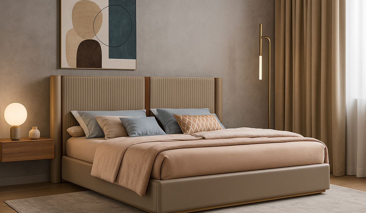 Для создания этого теплого интерьера спальни в современном стиле использована сдержанная палитра бежевых оттенков. Фактура стен, покрытых жидкими обоями Yursk Фиалка 1503, демонстрирует мягкость и рельефность покрытия, что идеально выражает уютную, спокойную атмосферу комнаты. Ее удачно дополняет карамельный тон ламината Kronostep Дуб Альпийский 8199 4V 32 класс 8 мм на полу и акцентная картина на стене. Роскошное изголовье большой кровати Alf Group Hera PJHR0202 Channel walnut-lacquer-e.stone гармонично сочетается с эстетикой штор и прикроватной тумбы. Ее традиционный комфорт дополняет большое количество подушек и покрывало Home&You Floss 75061-BEZ1-C2022-KOC 200*220 см бежевое. Асимметричное освещение в виде изящного золотистого торшера и компактной настольной лампы Altalusse INL-5103T-01 Gold добавляет легкой театральности и динамики пространству. Стильная деталь, ваза Cute классическая серый мрамор, на тумбе у кровати добавляет индивидуальности и завершенности интерьеру.