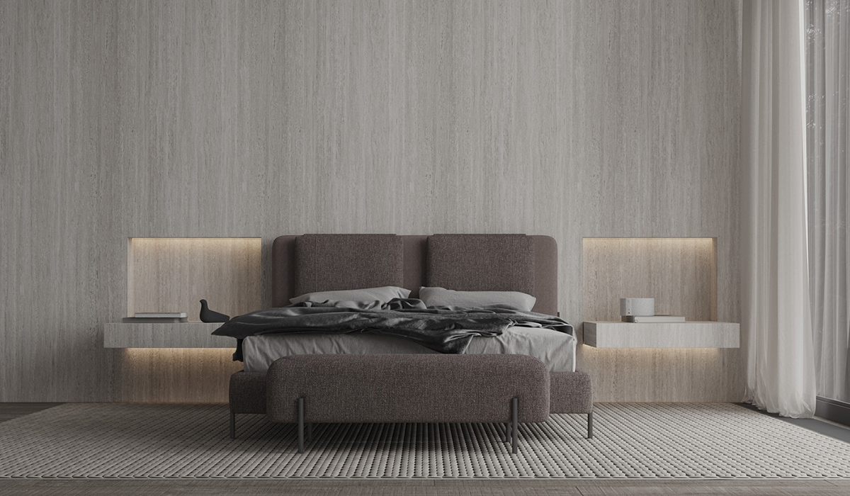 Идеальный серый фон приобретает особый драматизм в сочетании с шоколадным оттенком роскошной мебели спальни и интересной игрой света и теней. Купить кровать двуспальная Roshe Ларри Jeff 354 Zenit 48 коричневая означает создать волшебный островок комфорта и уюта в собственном доме. Нежный сатин комплекта постельного белья SoundSleep Утро на Мальдивах 51714704 200*220 см подарит сладкие сны и бодрые рассветы, ведь ткань изготавливается по новейшим технологиям и оказывает положительное влияние на здоровье и самочувствие человека. Банкетка Roshe Ларри Jeff 354 коричневая имеет практическое применение и эффектно дополняет ансамбль мягких поверхностей, приносящих приятное ощущение легкости и полезного отдыха. Серый ламинат Kronotex Standart 4175 Дуб столетний 32 класс 4V 7 мм, как хамелеон, меняет оттенок в зависимости от освещения и приобретает теплые краски в лучах закатного солнца. Невероятной сказочности и театральности добавляет отделка светодиодной лентой Feron LS108 COB IP20 320SMD/м 5 м белый прикроватного пространства, где функциональные полки имеют особое эстетическое исполнение. Монохромное плетение ковра добавляет красивой рельефности и домашнего уюта.