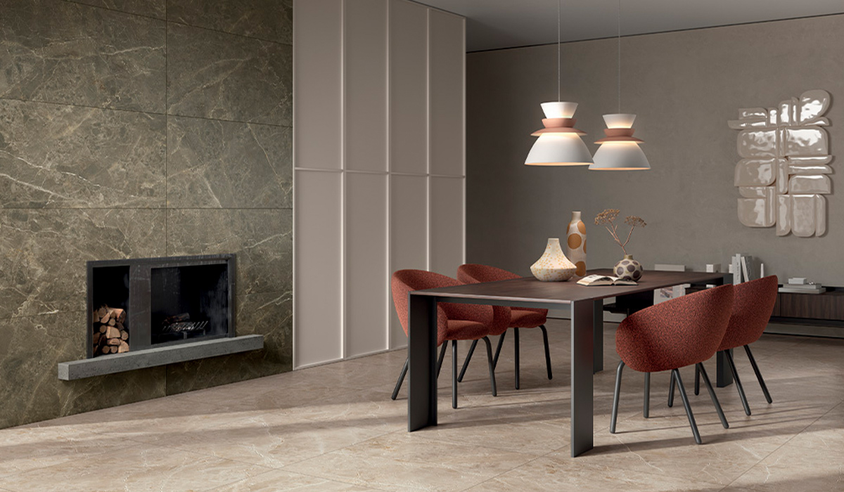 Нарядная столовая с камином сочетает функциональное пространство для ежедневных трапез и эстетику современной отделки. Светло-бежевый керамогранит Атем Moca BС PK Pol Rec 60*60 см на полу создает теплую элегантную базу и гармонию всего помещения. Стена вокруг камина выложена керамогранитом Intercerama Allure 205072/L Rec 60*120 см серого цвета, что добавляет практичности при использовании отопления и создает интересный эстетический акцент в сочетании со светлой поверхностью другой части отделки. Просторный стол обеденный раскладной Евродом Marlow DF-505-2T 120*80 см stone9/grey9 с эффектными терракотовыми стульями и декоративными вазами создает комфортное место для приема пищи. Два светильника подвесные Vesta Light NAOMI 56051-1 над столом обеспечивают мягкое освещение и лирическую атмосферу комнаты.