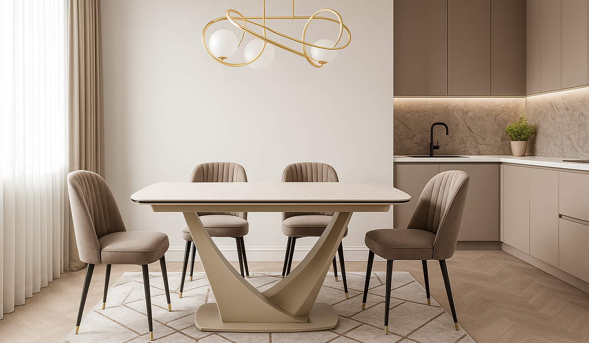 Место в доме, где собирается вся семья за столом, имеет особую атмосферу единения и наполнения. На фото столовая в теплых карамельных оттенках, что создает идеальное пространство для домашних трапез или приема гостей. Здесь гармонично сочетаются оттенки и структуры в элегантную картину тепла и уюта. Пол выложен ламинатом Kastamonu FIX KT701 Price Oak Stepclick 31 класс 7 мм, что создает светлый приятный фон для сбалансированного интерьера. Аккуратный плинтус Arbiton STIQ 80 ST820 белый 2200 мм придает фактурности стенам, защищая их от загрязнений и повреждений, закрывая щель между стеной и полом и придавая помещению законченный вид. Фасады мебели в мягком бежевом тоне легко гармонируют с красотой керамогранита Cersanit Marengo Light Grey Matt Rec 59,8*119,8 см светло-серого цвета, акцентированного эффектной подсветкой по периметру. Черный смеситель для кухни Kroner KRP Elbe-SCH030 стильно выделяется на общем фоне и подчеркивает нежные оттенки комнаты. Завершенную композицию составляет зона, где обеденный стол раскладной Vetro Элио TML-990 140*90 см сахара матовый/бежевый своей изящной формой сочетается с динамичным рисунком ковра. Удобные стулья обеденные деревянные Мебель Тиса Мика жасмин 16 с черными ножками обеспечивают комфорт за столом, удачно дополняя эстетику столовой.