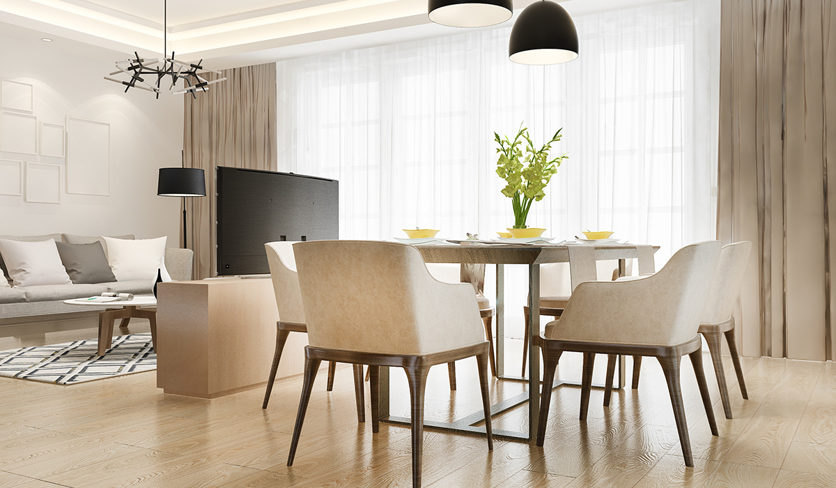 Большие окна комнаты - это всегда много солнца, тепла и дополнительного пространства. Такова столовая Kastamonu River, украшенная в нежных оттенках бежевой краски. Теплый фон дарит пол, который украшает ламинат Kastamonu River WR Danube Oak SRV001 5088738 4V 32 класс 8 мм и дарит ему прочность и безупречный эстетический вид. Главным акцентом комнаты является стол, сервированный для обеда тарелками квадратными глубокими Wilmax 991213 25 см и декорированный великолепным букетом гладиолусов в вазе Cristal D'Arques ARCHITECTE L8149 27 см. Над зоной трапезы размещены два светильника подвесные Nowodvorski Egg M 10318 черного цвета. Вокруг стола размещены стулья обеденные деревянные Bonsso Neapoli Magenta 12 бежевые, они прекрасно дополняют цветовую гамму столовой и обеспечивают комфорт жильцам. Пространство для отдыха отграничено удачным дизайнерским решением. Здесь размещен диван и телевизор, журнальный столик и элегантный торшер. Комната дарит спокойствие и уют для домашних застолий и отдыха.