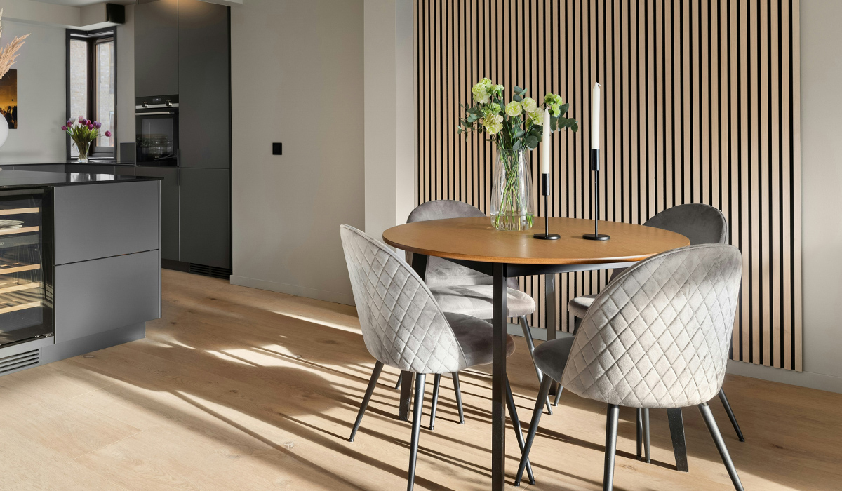 Место для домашних завтраков, семейных обедов и уютных ужинов - особая часть помещения, объединяющая всех жителей. Обустройство такой зоны требует практичности и эстетики для комфортного времяпрепровождения. Главным ее атрибутом является круглый стол KAJA black D80 дуб вместе со стульями металлическими Twinsann Миро Люкс Magic 2217 серого цвета, обеспечивающих удобство для приема пищи. Природный фон вырисовывает ламинат Kronopol Sigma D5379 Дуб Аполлония/Дуб Корин 32 класс 4V 8 мм на полу, что гармонично сочетается с темными фасадами мебели. Стены отделаны интерьерной краской акриловой Ceresit IN 53 Lux база А 10 л с минеральными наполнителями и пигментами, что равномерно подчеркивает их структуру. Привлекательности интерьеру добавляет декоративная акустическая панель АП-002 DALI87 дуб ликата 300*30*2800 мм, активно поглощает шумы и лишние звуки. Ваза Bohemia Crystal Petra B82530 14,5 см с цветами и элегантные подсвечники на столе создают особую атмосферу домашнего тепла и подъема.