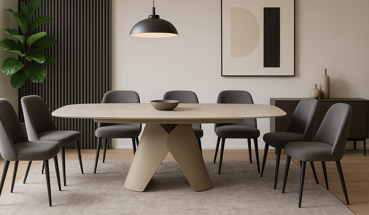 Современный модерн предполагает использование природной палитры цветов, плавность форм и растительные акценты. В столовой комнате, что на фото, преобладает светлый бежевый оттенок в контрастном сочетании с черным. Пол здесь выполняет роль фона, не привлекает слишком много внимания и добавляет тепла своим карамельным оттенком дерева. Стена немного светлее, обрамлена плинтусом ТИС ПЛГ-0001 с коэкструзией белым 56182500 мм. Угол эффектно выделяет 3D-панель MARCO decor 11920-707-SP серый бетон 119202900 мм (0,34 кв.м), рисуя структурную ребристую поверхность, которая улучшает звуковое восприятие и визуальную многогранность комнаты. Центральную часть занимает просторный обеденный раскладной стол Vetro Париж TML-997 160*90 см иджео беж/бежевый со стеклокерамической поверхностью, он обогащает интерьер изысканным мраморным рисунком. Комфортные обеденные металлические стулья Bonsso Pio New Darwin 452 серые, расположенные вокруг стола, имеют прочную конструкцию и элегантный дизайн, подчеркивающий эстетику столовой. Для освещения помещения используется большой подвесной светильник Vio Concept AtVC VCDS-MD76651A-1S черный над столом, который эффектно выделяет зону приема пищи. В небольшом комоде Piaski Nova KSZ104 черном можно разместить праздничную посуду, скатерти или сменный декор. Выразительным признаком модерна и свежим акцентом комнаты является растение с широкими листьями в углу. Оно подчеркивает убранство столовой, внося яркие краски и природные черты в ее дизайн.