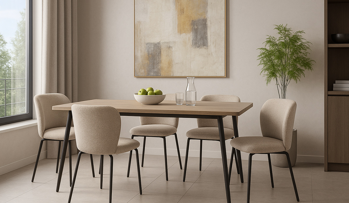 Свежие яркие акценты столовой комнаты Opoczno Camelia оживляют монохромный интерьер теплых бежевых оттенков. Они добавляют естественности и выразительности гармоничному фону, созданному сочетанием цвета жидких обоев Ecopaper Эколайн 751 на стенах и плитки Opoczno Camelia Cream 42*42 на полу. Центральное внимание привлекает большая картина на стене в золотистой раме, подчеркивающая изысканность комнаты. Справа расположен пенал левый Deli R1 дуб больцано/черный для хранения посуды, текстиля или других вещей. Большой стол BERN black H25 бук позволяет удобно разместиться всем членам семьи во время торжественных трапез или повседневных обедов. Особый комфорт добавляют стильные стулья обеденные металлические Vetro М-140 в элегантной обивке цвета песка и изящными черными ножками. Просторное окно комнаты расширяет пространство, добавляя природных пейзажей и новых оттенков интерьеру. А сочные яблоки из собственного сада напоминают о силе и ценности родного дома, где всегда много тепла, нежности и любви.