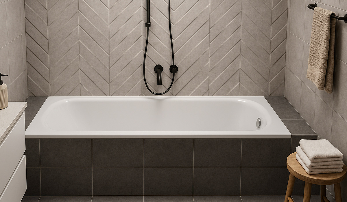 В планировке этой небольшой ванной комнаты удачно сбалансированы комфорт ежедневного использования и ее эстетический вид. Встроенная ванна прямая акриловая Kolo Sensa 140×70 без ножек традиционно выполняет важнейшие функции комнаты, предлагая просторное место для купания. Она элегантно облицована плиткой Golden Tile Lofty 4LУ800 40×40 антрацит, что придает ей опрятный и завершенный вид. Дизайн плитки красиво сочетается с керамогранитом Cersanit Concrete Style grey 1с 42×42 см, а геометрический узор отделки добавляет динамики и интересного визуального эффекта. Прямоугольная тумба подвесная Respect-M Nerro ТП-2 70 с умывальником Sava 70 см белая является отличным функциональным дополнением, которое легко сочетается с другими элементами сантехники. Выразительные акценты в интерьере создают черные аксессуары, такие как держатель для полотенца Ferro Greta AGR09BL и душевой набор KFA Armatura Moza 841-225-81 Black. Они придают комнате стильный и завершенный вид, гармонично балансируя цветовую палитру.