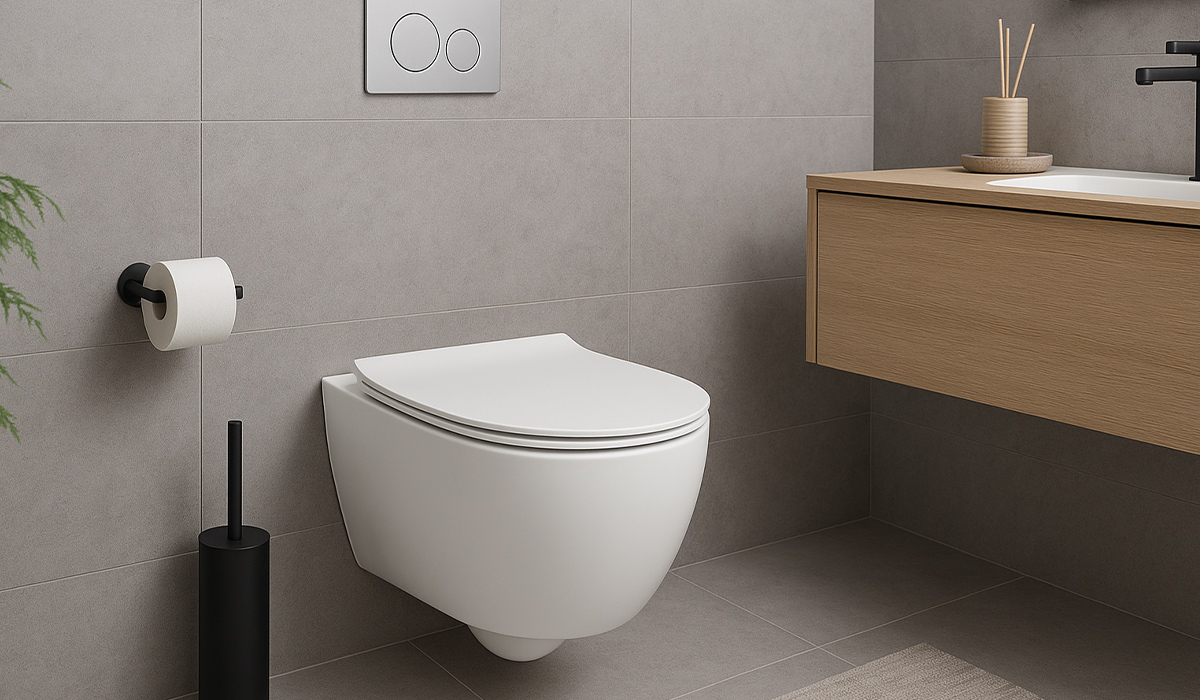 Оформление ванной комнаты в квартире или доме имеет важное значение, ведь комфорт и уют в повседневных делах влияет на самочувствие и настроение в течение дня. На фото видим уголок стильной комнаты, отделанной керамогранитом Cersanit Dreaming light grey 1с 29,8×59,8 см в базовом сером цвете. На таком фоне белая керамика унитаза подвесного Cersanit Luna Clean On S701-871 с дюропластовым сиденьем Lift выглядит особенно элегантно и лаконично. Овальный умывальник Jaquar Florentine FLS-WHT-5701 55×42,5 см белого цвета, вмонтированный в столешницу, добавляет функциональности и теплоты благодаря деревянному дизайну тумбы. Видимой частью инсталляционной системы является кнопка смыва Koller Pool Twist KP-TW-003 белая на стене, что обеспечивает удобный смыв и эстетичный вид. Черный держатель туалетной бумаги Trento Palermo и ершик для унитаза Arino Black Mood добавляют выразительных акцентов, подчеркивая важность таких деталей в интерьере ванной комнаты.