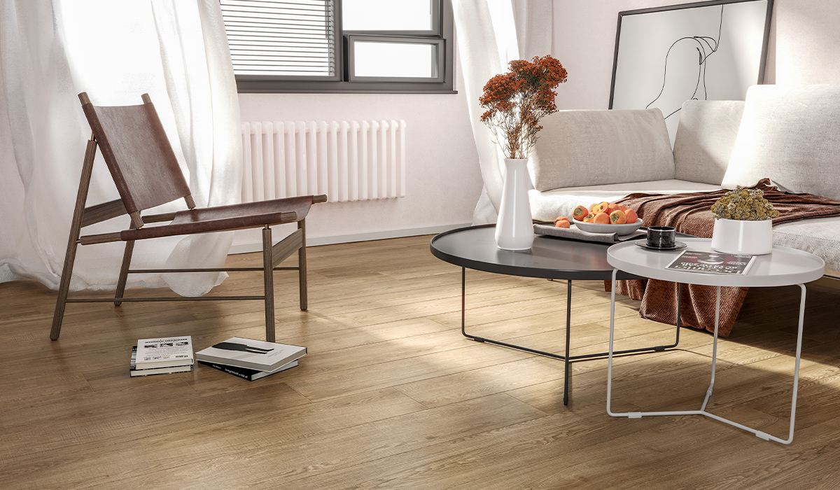 Данная гостиная наполнена теплом и уютом благодаря удачно подобранным материалам. Пол из керамогранита Golden Tile Terragres Brandy S27П20 в коричневом оттенке напоминает деревянную текстуру, создает атмосферу природной гармонии. Ее крупные, изящные плиты добавляют пространству ощущение натуральности. На стены нанесены жидкие обои Bioplast Ванда 011, которые подчеркивают мягкость интерьера благодаря нежной фактуре и приятному цвету. Белый матовый плинтус Arbiton Indo70 деликатно разделяет стены и пол, создавая аккуратный переход, подчеркивая чистоту линий. Это идеальное сочетание отделки для создания уютного и современного помещения.
