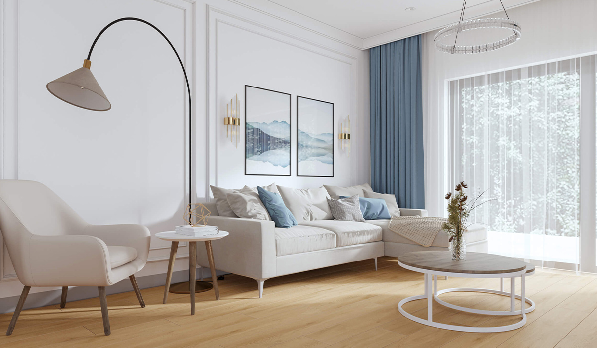 Представьте себе идеальную гостиную, где каждый элемент говорит об элегантности и комфорте. На первом плане - керамогранит Golden Tile Terragres Dakota DT1120 19,8*119,8 см светлое дерево, который простелился на полу, придавая пространству особую теплоту и стиль. У большого окна находится угловой диван Merx Lounge, который предлагает мягкое и удобное место для отдыха и общения. На нем раскинут вязаный плед Прованс Soft косы, размером 220*240 см в нежном оттенке латте. Сбоку можно увидеть кресло Лестер молочное, которое не только дополняет зону отдыха, но и придает пространству структурированность и гармонию. Один из комплекта журнальных столиков Milan S2 в белом цвете расположен между диваном и креслом, создавая функциональную зону для чтения или вечерней чашки чая. На потолке вмонтирована изысканная подвесная люстра Sirius B S2030/1 38W LED, которая будто танцует светом, придавая гостиной завершенность и привлекательность, формируя неповторимую атмосферу уюта и элегантности.