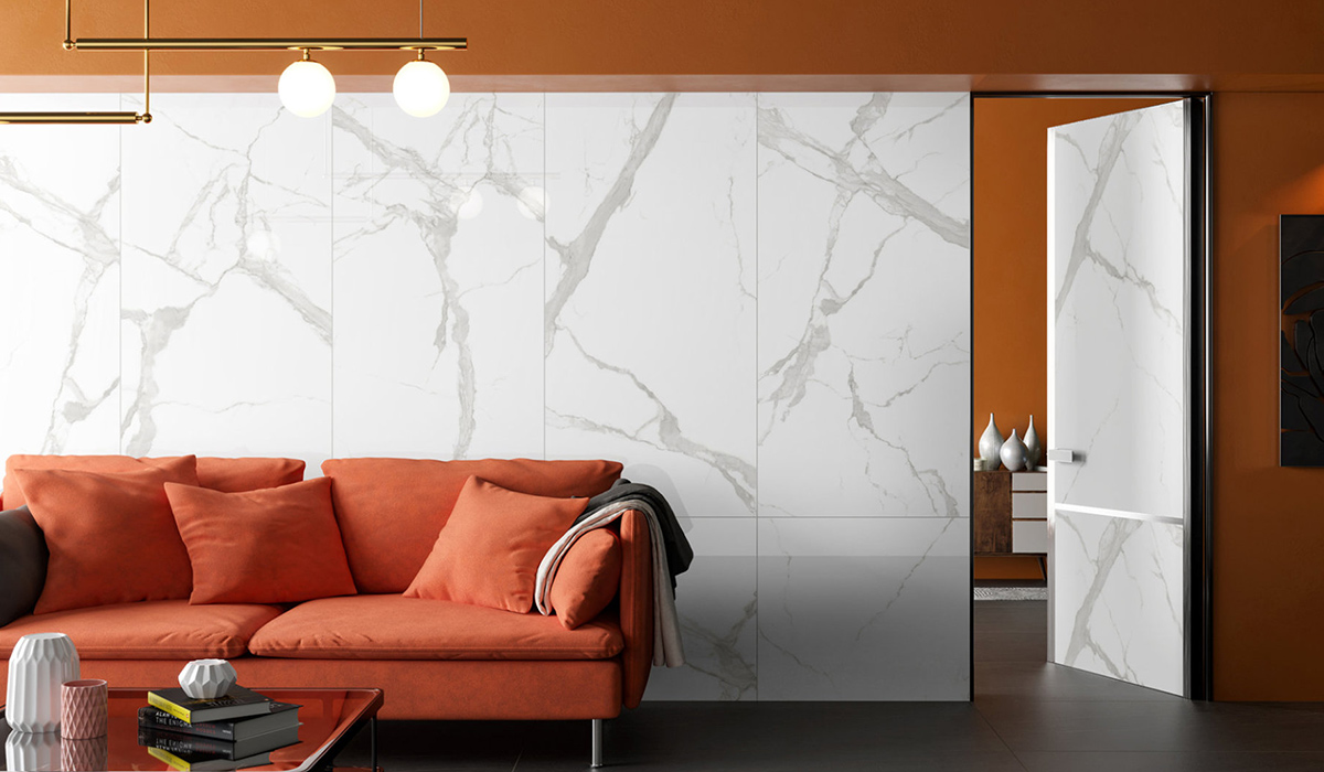 Эта гостиная привлекает внимание яркими оранжевыми акцентами и динамическими сочетаниями цветов. Черный керамогранит Rako Fox Black в формате 33*33 см выложен на полу, придает пространству глубины и контрастирует с выразительными элементами интерьера. Акцентная стена, украшенная белым керамогранитом Opoczno Calacatta Marble, вносит нотки элегантности и делает комнату визуально более просторной.