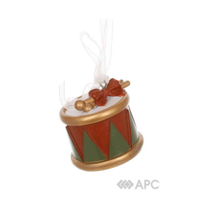 Фигурка выполнена в форме миниатюрного барабана и изготовлена из прочного материала — полистоуна. Он имеет классическую рождественскую расцветку: корпус украшен чередованием красных и зеленых треугольников, а ободки и палочки выполнены в золотом цвете. К верхушке барабана прикреплен декоративный красно-коричневый бант и прозрачная лента для подвешивания на елку. Общие размеры изделия составляют 4,7х4,7х5,3 см.
