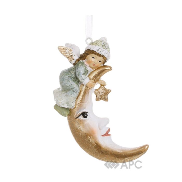 Фигурка изготовлена из прочного полистоуна и представляет собой композицию: милый ангел в зеленом наряде и шапочке лежит на золотистой луне, которая имеет рельефную поверхность, украшенную блестками (глиттером), и выполнена в форме лица. Ангел держит в руке золотистую звездочку.