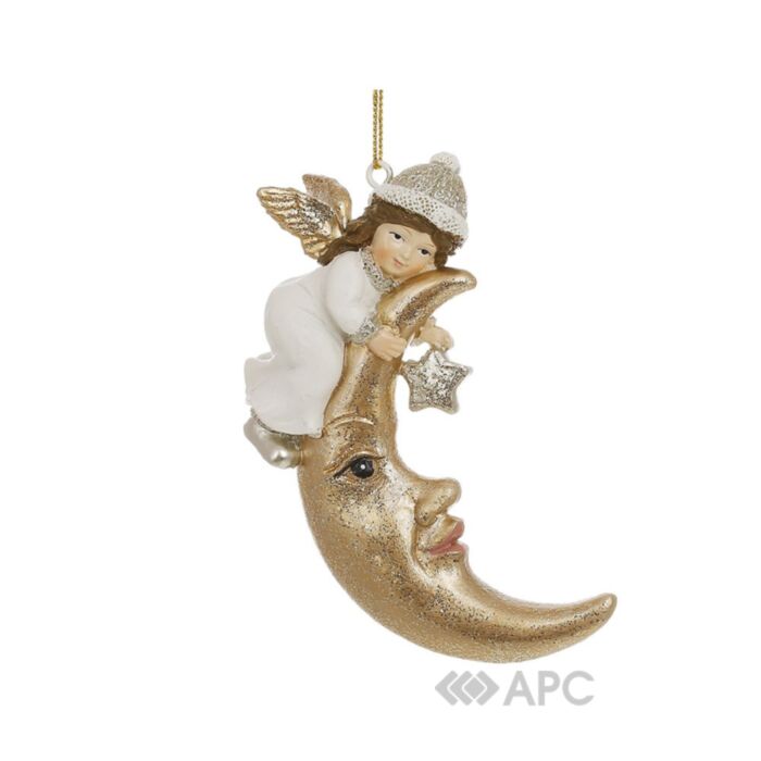 Фигурка изготовлена из прочного полистоуна и представляет собой композицию: милый ангел в белом наряде и шапочке лежит на золотистой луне, которая имеет рельефную поверхность, украшенную блестками (глиттером), и выполнена в форме лица. Ангел держит в руке серебристую звездочку.
