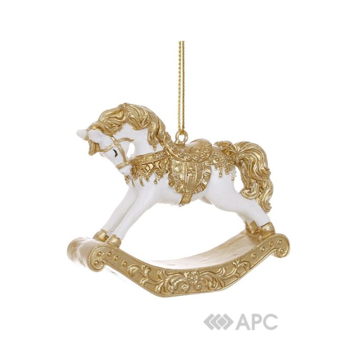 Украшение выполнено в форме лошадки-качалки и изготовлено из прочного материала — полистоуна. Оно имеет элегантное сочетание цветов: основной белый гармонично дополнен насыщенным золотом, которое используется для гривы, хвоста, седла и полозьев качалки, придавая изделию роскошный блеск. Подвеска оснащена золотистым шнурком для удобного крепления на елку. Общие размеры изделия составляют 7,5х2х6,5 см.