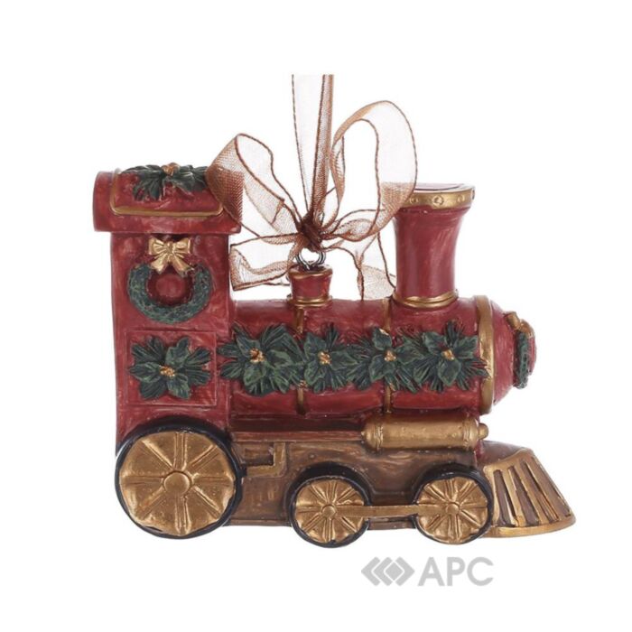 Украшение выполнено в форме миниатюрного локомотива и изготовлено из прочного материала — полирезины. Паровозик имеет насыщенный красный цвет, а его колеса, окна и другие металлические элементы декорированы золотистыми акцентами. Праздничности добавляют зеленые рождественские венки и гирлянды с шишками. Игрушка имеет размеры 7,5х1,5х6 см и оснащена декоративной коричневой лентой для удобного подвешивания на елку.