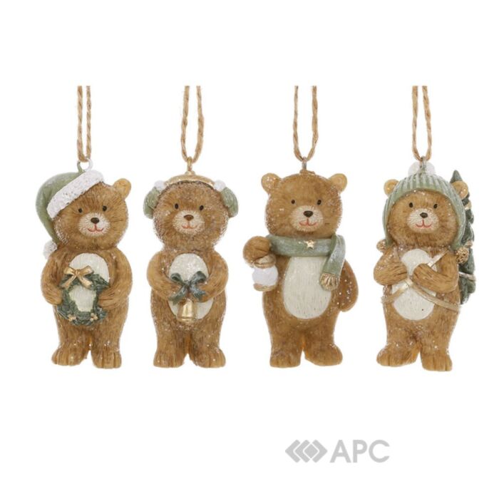 Каждая подвеска изготовлена из прочного полистоуна и представляет собой милого медвежонка Тедди в зимнем наряде. Фигурки имеют теплую светло-коричневую основу, дополненную элементами зеленого цвета (шапочки, шарфы, аксессуары), что подчеркивает их рождественскую тематику. Животные держат в лапках праздничные атрибуты: венки, колокольчики, фонарики и елки.