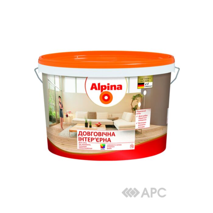 Интерьерная краска акриловая Alpina Долговечная В3 обладает высокой способностью к очищению чем обеспечивает долговечность окрашенных оснований. Предназначена для окраски обоев, кирпичных, оштукатуренных, гипсокартонных, бетонных поверхностей. Дисперсионное средство создает прозрачное шелковисто-матовое покрытие. Основы, покрытые акриловой краской Alpina Долговечная В3 отличаются особой устойчивостью к загрязнениям.