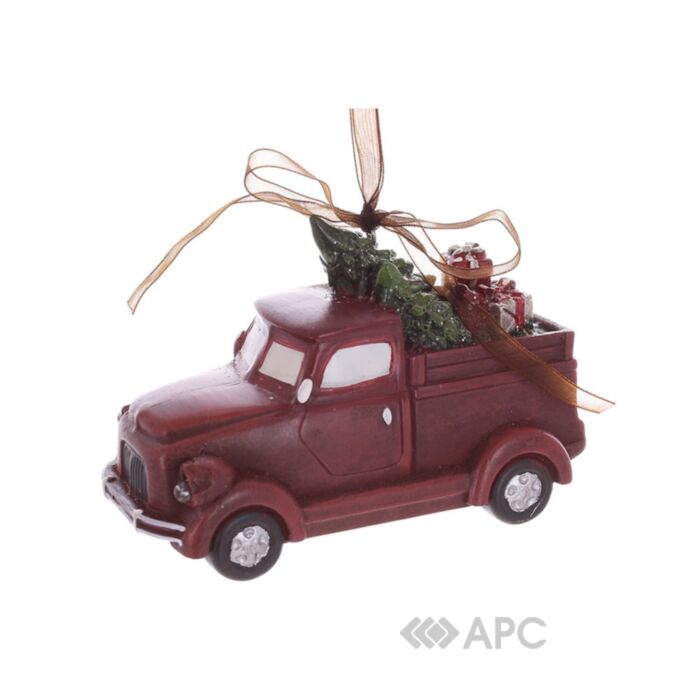 Фигурка выполнена в форме винтажного грузовика (пикапа) насыщенного темно-красного (бордового) цвета и изготовлена из прочного материала — полистоуна. В кузове машинки размещена новогодняя елка и подарки, что создает атмосферу подготовки к празднику. Дополнительную праздничность добавляет LED подсветка и декоративная коричневая лента для подвешивания на елку. Общие размеры изделия составляют 12х7 см.