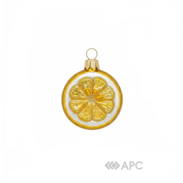 Выполнена в форме круглого среза апельсина (лимона или другого цитрусового). Она изготовлена из качественного стекла и искусно расписана: центральная часть имитирует сочные дольки, выполненные в ярко-желтых и золотистых оттенках, обрамленные белой мякотью и золотистым контуром. Игрушка имеет глянцевое покрытие и оснащена элегантным металлическим креплением для подвешивания. Эта необычная, детализированная и сочная подвеска станет настоящей изюминкой вашего новогоднего декора.