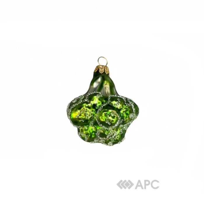 Выполнена в форме соцветия брокколи. Она изготовлена из качественного стекла и искусно расписана в различных оттенках насыщенного зеленого цвета. Рельефная поверхность, имитирующая структуру овоща, дополнительно украшена блестками (глиттером), которые создают эффект искрящегося инея. Игрушка имеет глянцевое покрытие и оснащена золотистым металлическим креплением для подвешивания. Эта креативная и детализированная подвеска прекрасно подчеркнет индивидуальность елки.