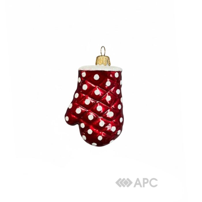 Выполнена в форме теплой зимней перчатки-варежки. Она изготовлена из качественного стекла и искусно расписана: перчатка имеет насыщенный красный цвет с рельефной, стеганой текстурой и декорирована белыми точками (горошком). Манжета белого цвета и покрыта блестками (глиттером), имитирующими пушистый мех. Игрушка имеет глянцевое покрытие и оснащена золотистым металлическим креплением для подвешивания. Эта традиционная, детализированная и праздничная подвеска станет прекрасным дополнением к вашей новогодней коллекции.