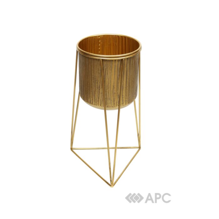 Кашпо имеет цилиндрическую форму с эффектной вертикальной ребристой поверхностью, которая создает интересную игру света и тени. Оно элегантно установлено на изящную геометрическую подставку, выполненную из тонких металлических прутьев, что придает изделию легкость и современную эстетику. Эта конструкция не только обеспечивает устойчивость, но и подчеркивает минималистичный и в то же время роскошный характер декоративного предмета, делая его идеальным выбором для создания интерьерных композиций.