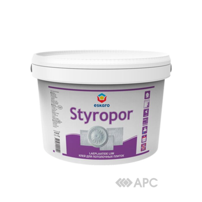 Eskaro Styropor — клей для изделий из стиропора. Прекрасно подходит для приклеивания падуг, багетов, потолочных плинтусов и подобных элементов. Также прекрасно сплавляется со склеиванием пенопласта, пробки, полиуретана. Водоразбавимая смесь. Одного литра хватает приблизительно на 3-5 м². Смесь не уседает после высыхания. Не имеет запаха. Высокая адгезия с поверхностью. Белый цвет маскирует стыки, легко шлифуется. Допускается нанесение на древесину, бетон, стружечные плиты, штукатурку и т.д. Позволяет корректировать положение элементов еще 10 минут после приклеивания. Полное высыхание от 6 до 24 часов.