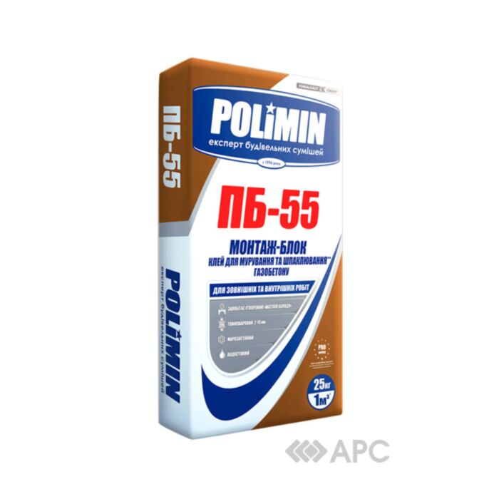 Клей для пено- и газоблоков Полимин ПБ-55 25 кг - готовый сухой клеевой состав для оштукатуривания и кладки стеновых бетонных, силикатных, известняковых и кирпичных блоков. Также его можно эффективно использовать для оштукатуривания поверхностей блоков.