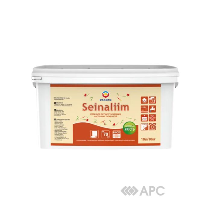 Eskaro Seinaliim — высококачественный клей для обоев. Прекрасно подходит для сктеклообоев, флизелиновых, виниловых, текстильных и бумажных обоев. Позволяет корректировать положение полотна до того, как клей схватится. В состав входят модифицированный крахмал, дисперсия на основе винила, а также биоцид, целью которого является защита стен и покрытия от появления грибков и плесени. Одного литра в среднем хватает на площадь в 3-7 м². Высокая адгезия, бесцветный шов.