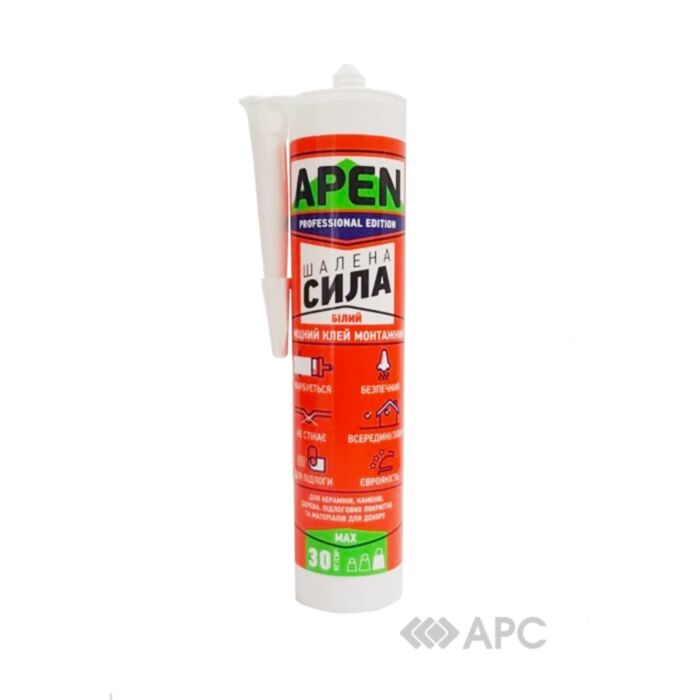Клей монтажный акриловый Apen Безумная сила 280 мл - это высококачественный однокомпонентный акриловый клей для настенных и напольных покрытий с нулевым сползанием. Продукт характеризуется высокой адгезией ко всем поверхностям. После высыхания образует водостойкий прочный клеевой шов. Выдерживает большие нагрузки и деформации, обеспечивает долговечность склеивания. Продукт является экологически чистым и не содержит растворителей. Изготовлен по европейским стандартам качества. Универсальный монтажный клей на акриловой основе Apen Безумная сила 280 мл Безумная сила 280 мл является уникальным продуктом и применяется для работ со всеми "сложными" основаниями. Купить клей акриловый Apen Безумная сила 280 млможно в интернет магазине АРС. У нас всегда актуальная и доступная цена. Доставка осуществляется по Украине - Киев, Харьков, Львов и др.