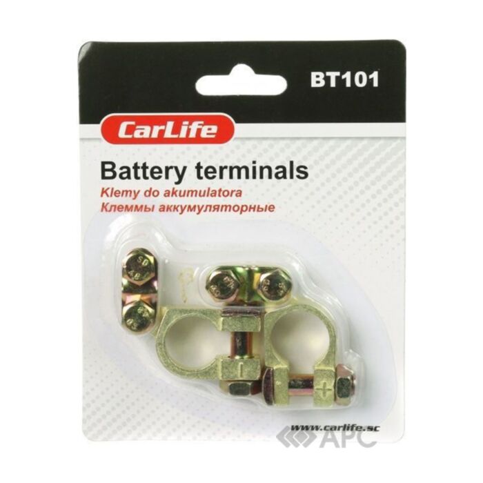 Клеммы CarLife ВТ101 для аккумулятора 2 шт. — это вид зажимного приспособления, которое обеспечивает надежное соединение концов электропроводки на источниках питания. Производятся элементы из сплава меди с цинком, которые характеризуются повышенной проводимостью тока. Высокое качество клемм обеспечивает стабильность работы всей электроники, поскольку они могут поддаваться окислению из-за воздействия влаги в воздухе. Клеммы аккумулятора обеспечивают нормальную работу АКБ, но именно они и подвергаются наибольшему износу.