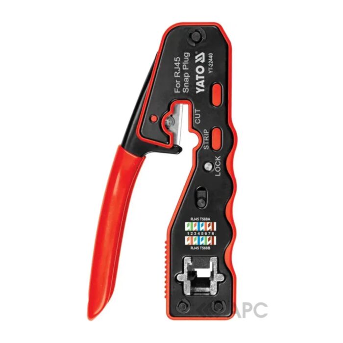 Клещи обжимные для зачистки кабелей Yato RJ45 YT-22440 - это надежный инструмент, предназначенный для работы с разъемами RJ45, включая сквозные коннекторы. Они обеспечивают качественное обжатие, позволяют снимать внешнюю изоляцию и перерезать сетевые кабели. Корпус изготовлен из прочной углеродистой стали, которая прошла процесс окисления, что придает ему устойчивость к коррозии и увеличивает долговечность. Длина инструмента составляет 135 мм, обеспечивая удобство в использовании даже в труднодоступных местах. Замковый механизм повышает безопасность работы, а эргономичные пластиковые рукоятки гарантируют комфортный захват. Благодаря своей многофункциональности и высокому качеству исполнения, эти клещи идеально подходят для электромонтажников и мастеров, работающих с сетевыми проводами.