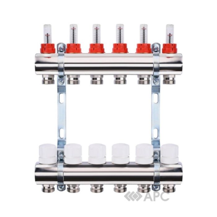 Коллекторная группа ECO Technology 001A 1"х3/4" 6 контуров производится из никелированной латуни и оснащена расходомерами, регулятором и креплением. Максимальная рабочая температура изделия — 95℃. Такая система отличается высоким качеством и долговечной эксплуатацией, простотой монтажа, точностью контроля и регулирования потоков каждого контура. Благодаря ей мастер может отключить любой участок трубопровода от водоснабжения, чтобы отремонтировать его, не нарушая функционирование всей отопительной системы в целом. Надежность коммуникации также повышается благодаря тому, что коллекторная группа сокращает количество скрытых трубных соединений.