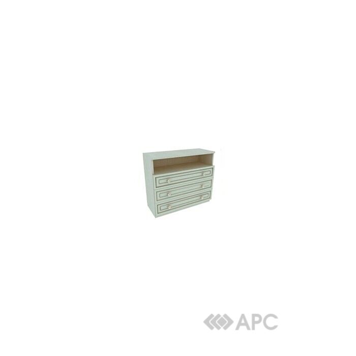 Состоит из трёх выдвижных ящиков и открытой полки. Фасады ящиков комода выполнены способом многослойной покраски (нанесение патины), благодаря которому визуально выглядят с эффектом старения.