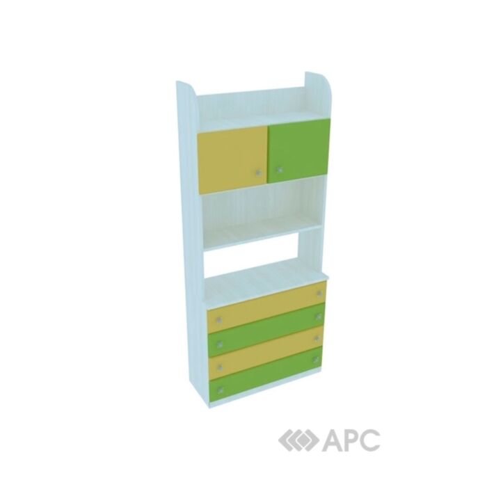 Стеллаж состоит из комода на четыре выдвижных ящика и надстройки с полочками.