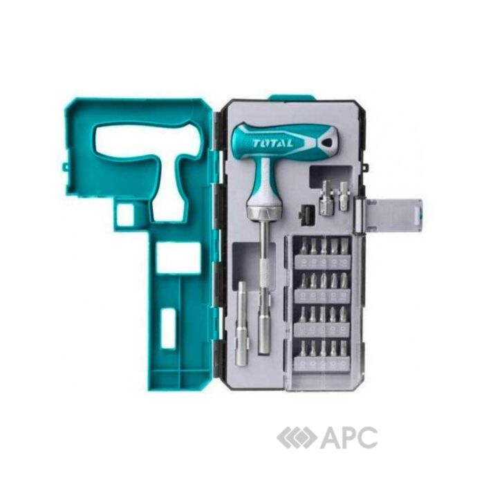 Набор Total TACSD30256 включает в себя следующие элементы: Отверточная рукоять Т-образная под биты с реверсом. Магнитный держатель для бит. Входной присоединительный квадрат 1/4" Выходной присоединительный квадрат 3/8" Крестообразные биты PH0, PH1, PH2, PH2, PH3. Крестообразные биты PZ1, PZ2. Плоские биты SL3, SL4, SL5, SL6, SL6. Шестигранные биты H3, H4, H5. Биты-"звездочки" T10, T15, T20, T25, T30. Пластиковый кейс.