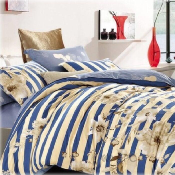 Изготовлены наволочки, пододеяльник и простынь из износостойкого и долговечного хлопка. Основная палитра - это бело-синие оттенки. Вместе они образуют полосатый узор, который дополнительно декорирован цветочными рисунками.