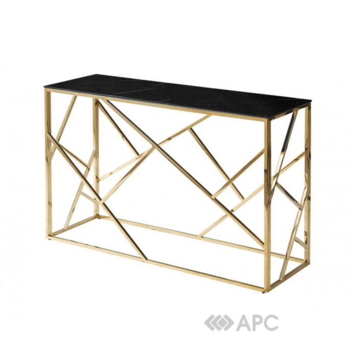 Каркас выделяется оригинальной формой, производится из прочной, нержавеющей стали, золотого оттенка, что имеет длительный срок эксплуатации. Максимально допустимая нагрузка 50 кг, размер столешницы 120х40 см, толщина 8 мм, высота изделия 78 см. Продается в разобранном виде.