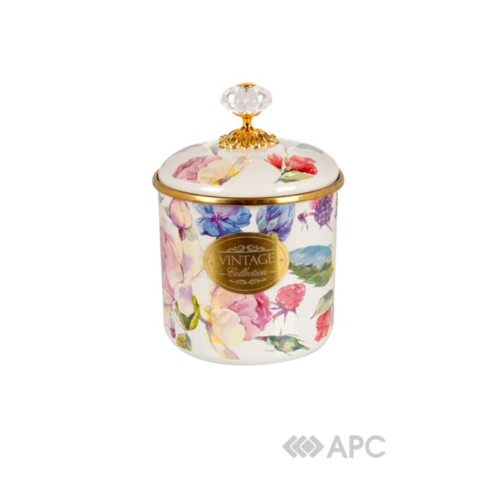 Контейнер украшен ярким цветочным узором на светлом фоне, имеет золотистые элементы и крышку с декоративной ручкой в форме кристалла.
