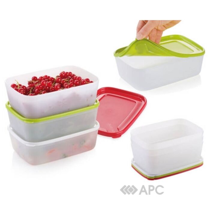 Контейнеры изготовлены из прочного пластика, отлично подходят для гигиенического хранения продуктов в морозильнике или холодильнике. Используемый материал нейтрален, не влияет на вкусовые качества блюд при долгом хранении. Банки пластичные, легко открываются и закрываются. Оснащены цветными крышками для удобства. Контейнеры плотно становятся друг на друга для экономии места. Можно использовать в морозильной камере, холодильнике, микроволновке и в посудомоечной машине.