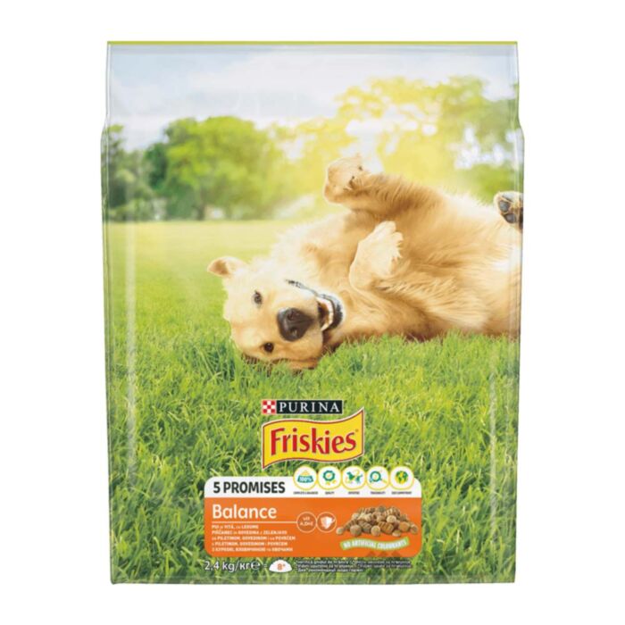 Корм для собак Friskies Balance с курицей, говядиной и овощами в упаковке 2,4 кг является идеальным выбором для сбалансированного питания вашего любимца. Он содержит цельные злаки (не менее 58%), покрывающие потребность в углеводах. В состав также входят мясо и субпродукты животного происхождения, являющиеся источником высококачественного белка, способствующего сохранению мышечной массы, а также общего здоровья животного. Содержащиеся в составе животные жиры обеспечивают энергетические потребности собаки. Экстракты растительного протеина поддерживают оптимальный уровень протеина в рационе, а минеральные вещества помогают заботиться о здоровье зубов. Овощи насыщают организм витаминами и минералами, которые положительно влияют на иммунную систему.