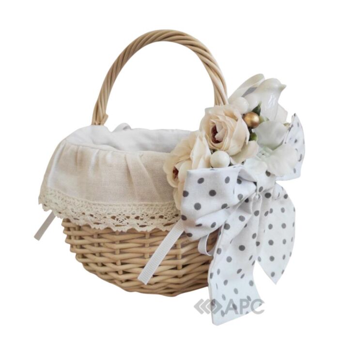 Корзина пасхальная HS №8 с декором бочка/беленая лоза — традиционный атрибут светлого праздника Воскресения Христова. Невероятная изысканность лозы и нежность текстильного декора обязательно понравятся настоящим ценителям пасхальной эстетики, а тем более деткам и подросткам. Стильная корзина диаметром 14 см для освящения кулича, писанок и других пасхальных блюд украшена белым бантом, кружевом и веточками искусственных цветов.